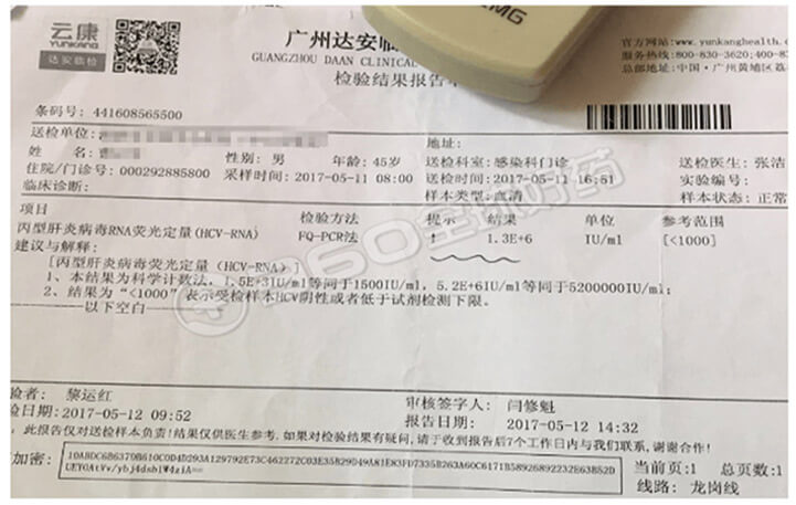 曹先生16年底因为一次小手术发现感染丙肝,病毒量达到了1,300,000。这时候,曹先生对比丙肝的患病症状,才知道为什么最近两年多一直感觉肝区隐隐作痛,面色也是黄的吓人了。好在发现的不晚,目前还没有肝硬化的症状。