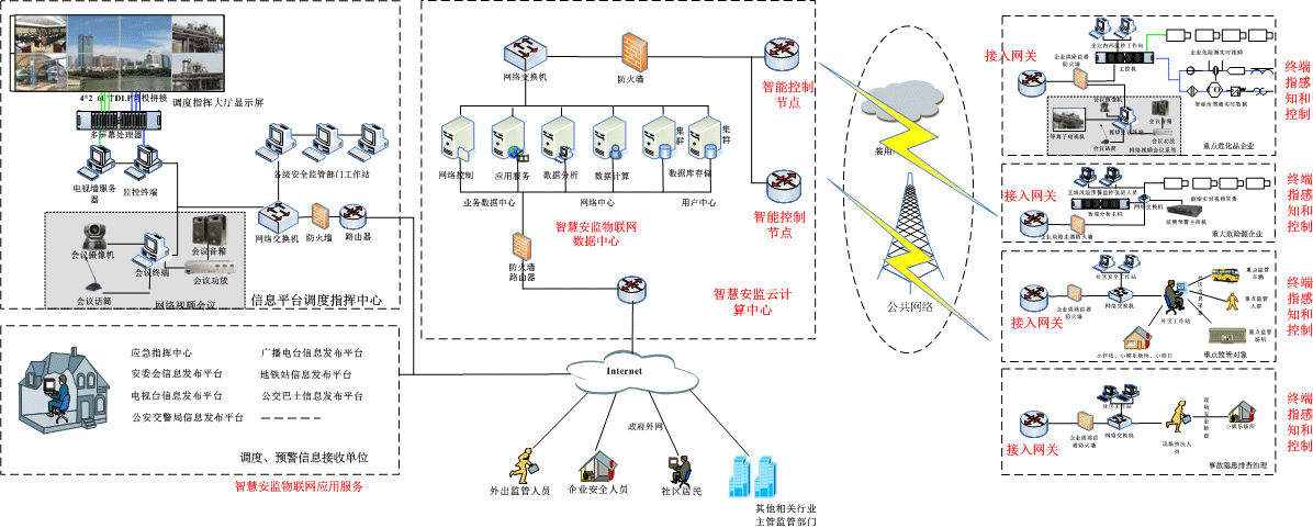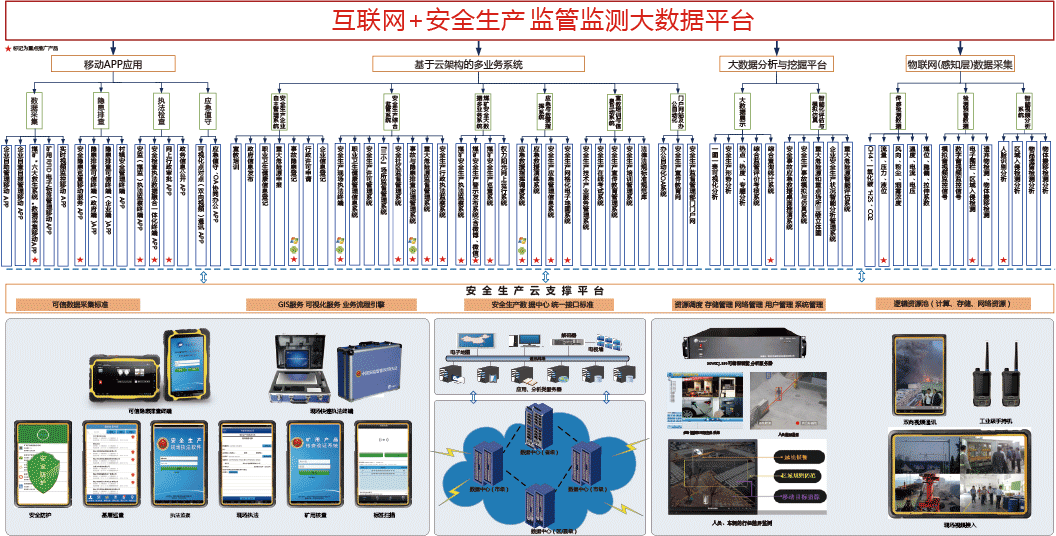 “互联网+”安全生产监管监测大数据平台将移动互联网、物联网、云计算技术等先进技术应用到安全生产监督管理业务中,通过感知数据的统一集中管理、海量信息的智能化处理,构建一个面向服务的智慧安监管理平台,实现安全生产要素实时监控、事故隐患智能分析、智慧安全管理、应急协同指挥、培训教育考核一体化的“互联网+”大数据管理创新模式,为企业安全生产和政府部门监督管理提供高效实时的智能应用与服务。
