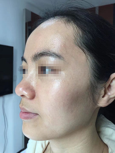 严女士面部肌肤有轻微黄气、两脸颊有黄褐斑。由于平日里经常使用含化学物质的防晒霜,清洗不干净容易堵塞毛孔;再就是做物理防晒比较少,皮肤经强烈的紫外线照射后,黑色素细胞活性增高,分泌的黑色素增多,汗腺不通,很难让色素代谢出体外,时间长了,色素就干涸堆积在表皮层。