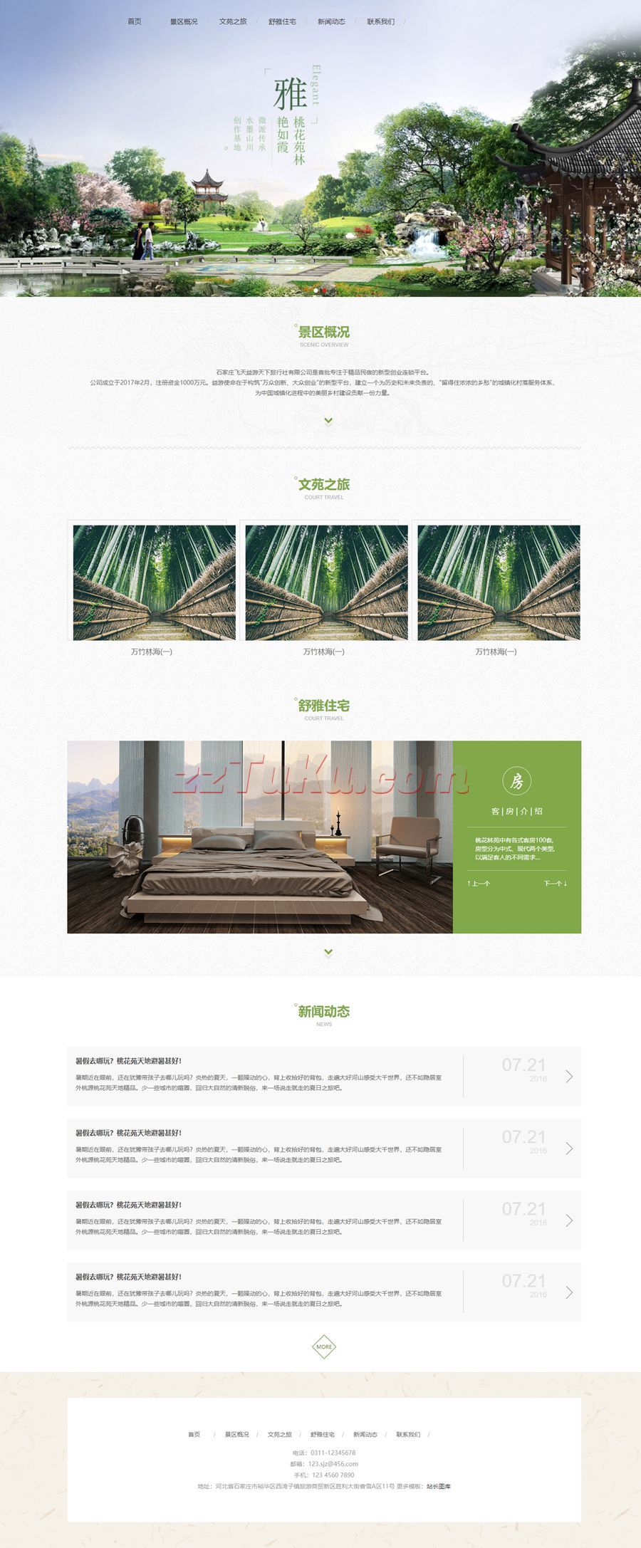 绿色和经典旅游胜地、旅行社服务公司和旅游景点规划和项目管理公司网站的html模板包括:景点概况、文远之旅、舒雅住所、新闻动态、联系我们等6页