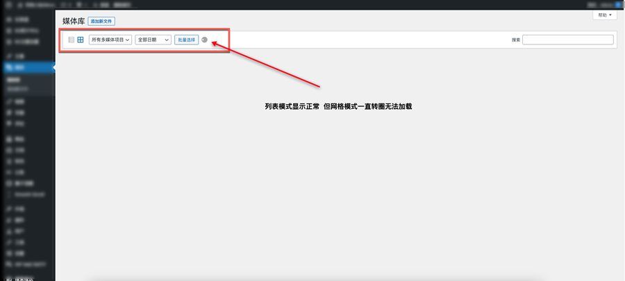 这两天我发现网站后台的媒体库居然加载不出图片了,而且也时而发生图片上传失败的情况,这种现象仅出现于使用oss upload插件作为媒体库,列表模式正常,grid网格模式却加载不出来,一直在转圈圈!