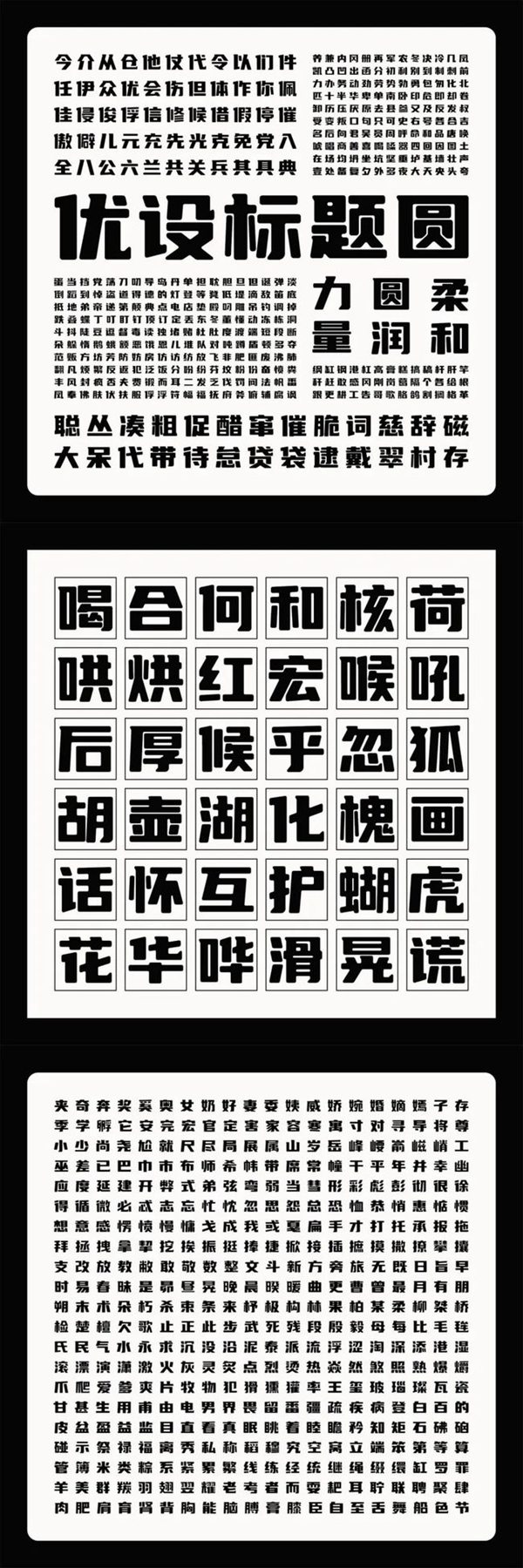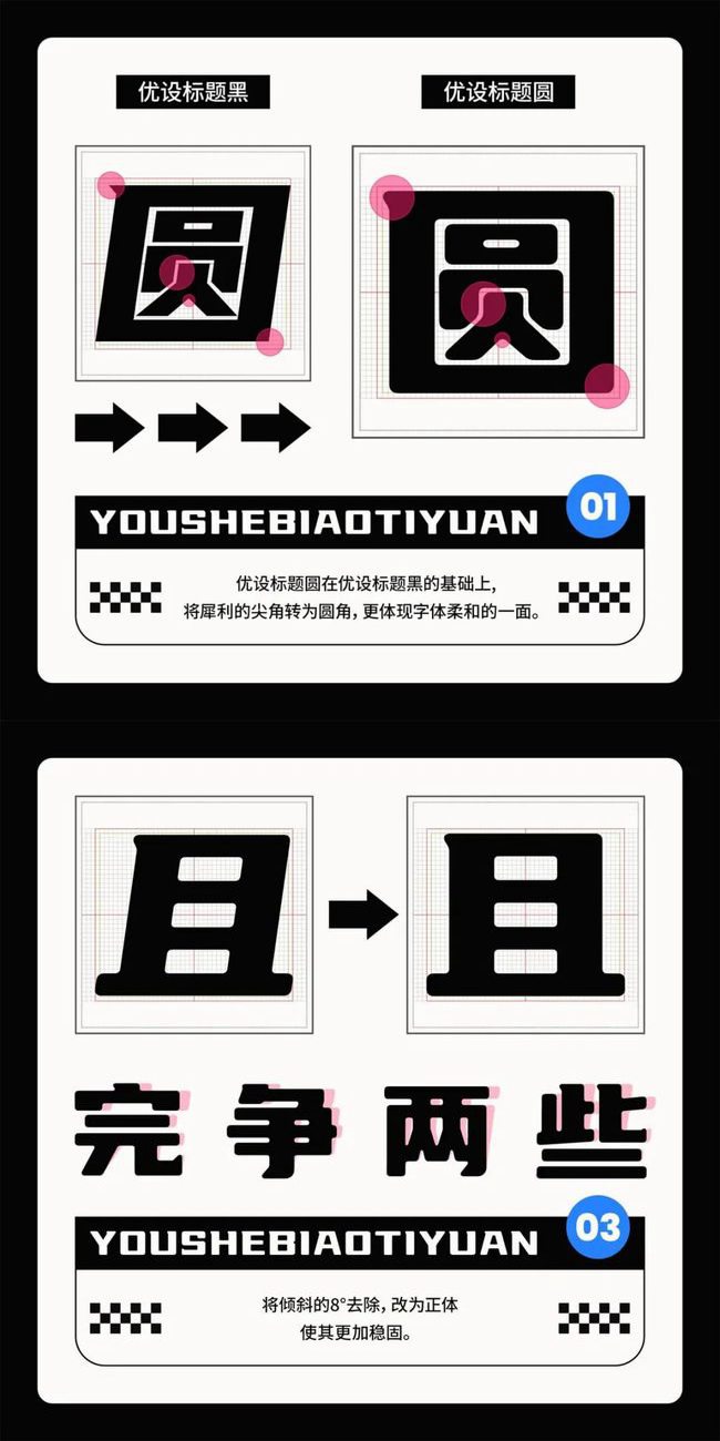 但这两年我们也观察到一个现象:大家在使用标题黑时,有概率会将它调正进行使用,多方调研和讨论后,我们决定在「优设标题黑」的基础上做一个全新的版本,让它的使用范围更加广泛。历经一年多的修改后,这款标题黑的升级版,也是优设第4款免费可商用的 中文字体 : 优设标题圆 。