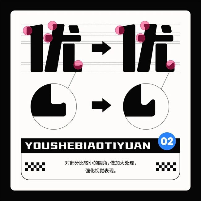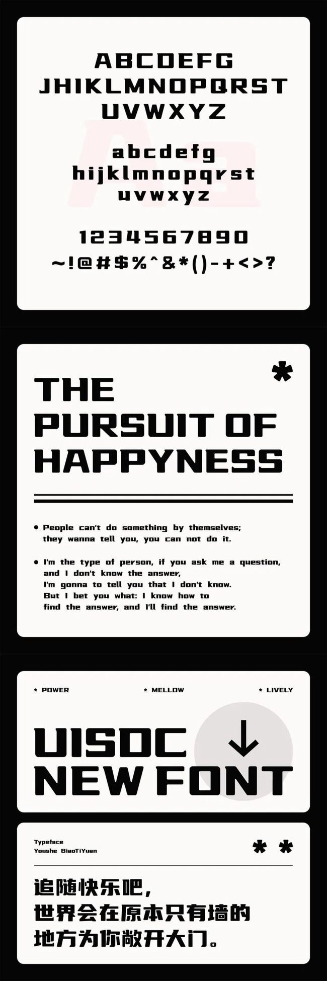 作为「优设标题黑」的兄弟版,这款字体在保留「优设标题黑」的力量感的基础上,将8°倾斜去除,从斜体变为正体,减弱速度感,增加稳固的感受: