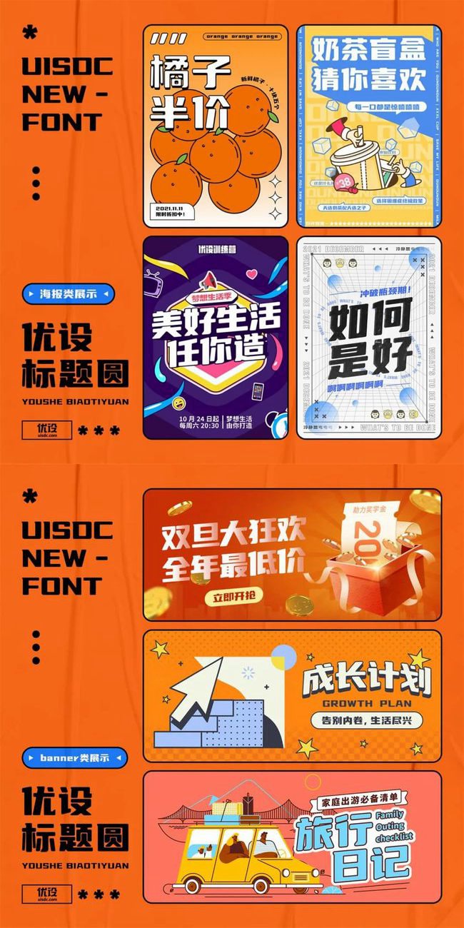 从「优设标题黑」发布至今已有两年多,在这款国民级字体发布后,优设马不停蹄,集结了团队的中坚设计师,继续发布了电商领域的宠儿「优设好身体」和另一个风格可爱的「优设字由棒棒体」。