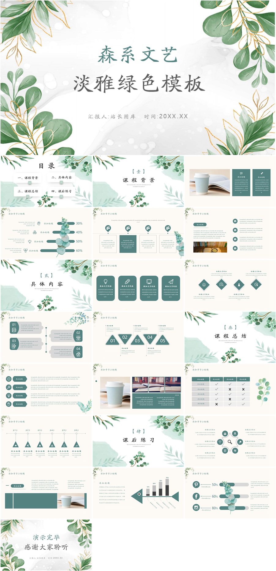转载请声明来自:站长图库 - 淡雅文艺绿色森系PPT模板使用声明: