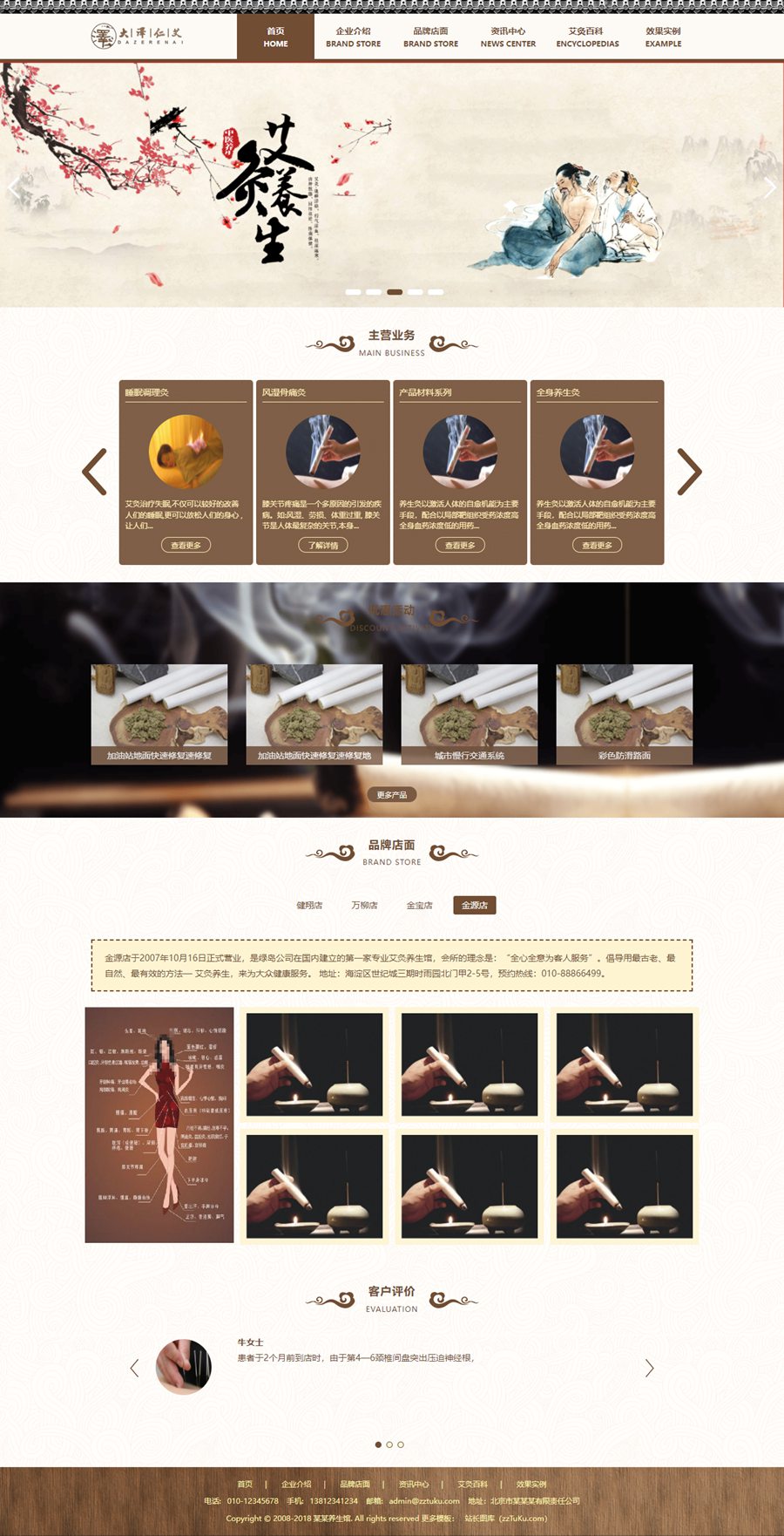 中国古典水墨风格的艾灸养生企业网站响应式模板html下载。主要有:艾灸百科、品牌店面、企业介绍、联系我们、团队风采、效果实例、新闻详情、资讯中心等一共9个页面。支持PC,平板,手机等各种设备,代码简洁。