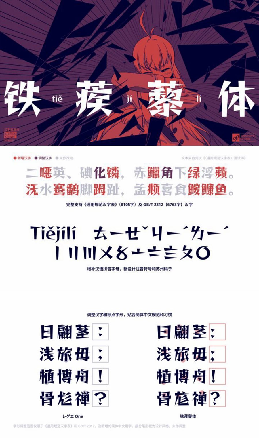 铁蒺藜体是一款造型尖锐的美术字体,基于 Fontworks 出品的日文字体レゲエ One 扩充、调整字形,并添加 OpenType 特性,以满足简体中文的使用需求。