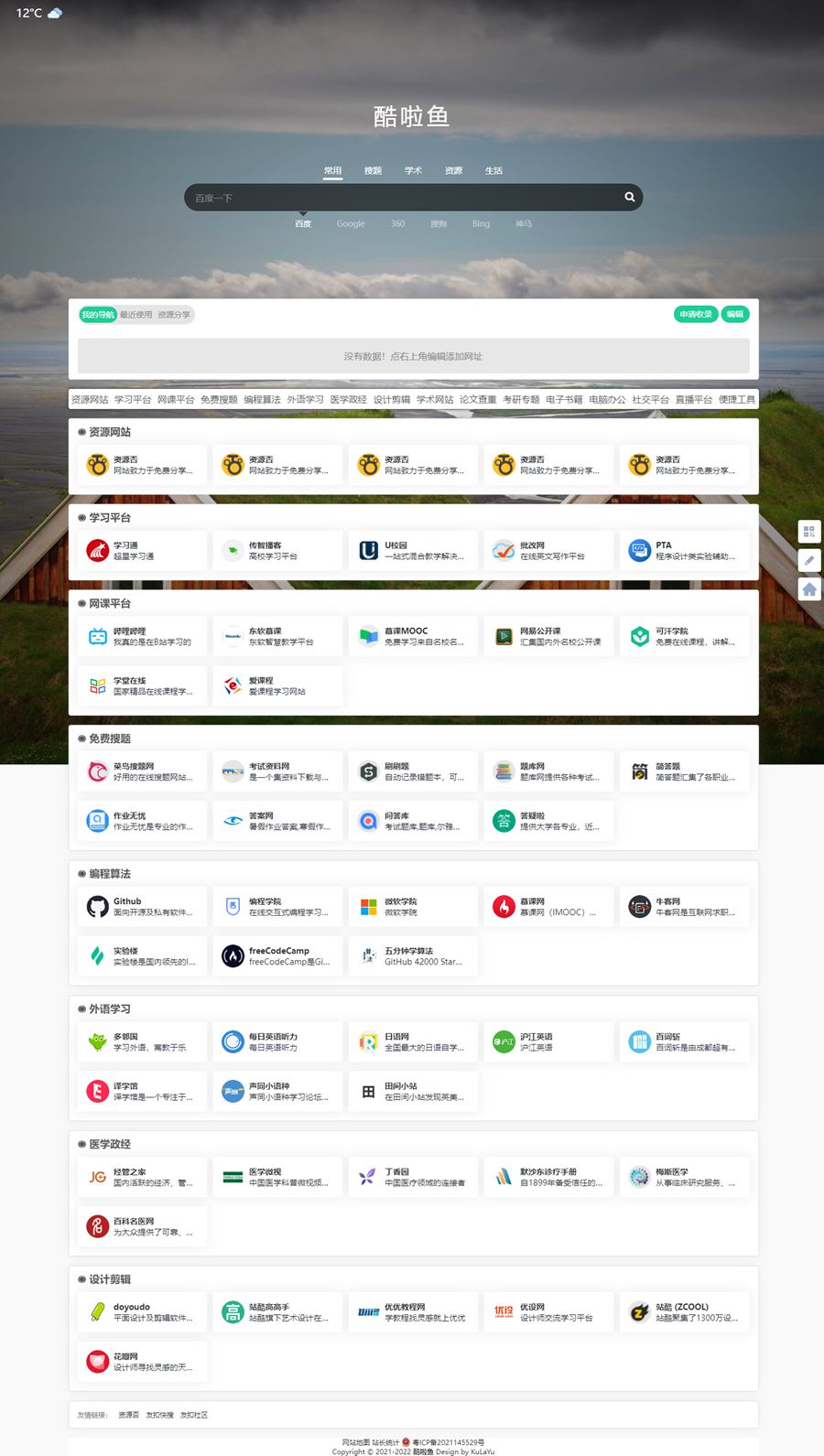 酷啦鱼导航主题模板,是一款基于WordPress的导航主题,酷啦鱼导航主题是个人基于wordpress+codestar framework框架设计的简洁导航主题。