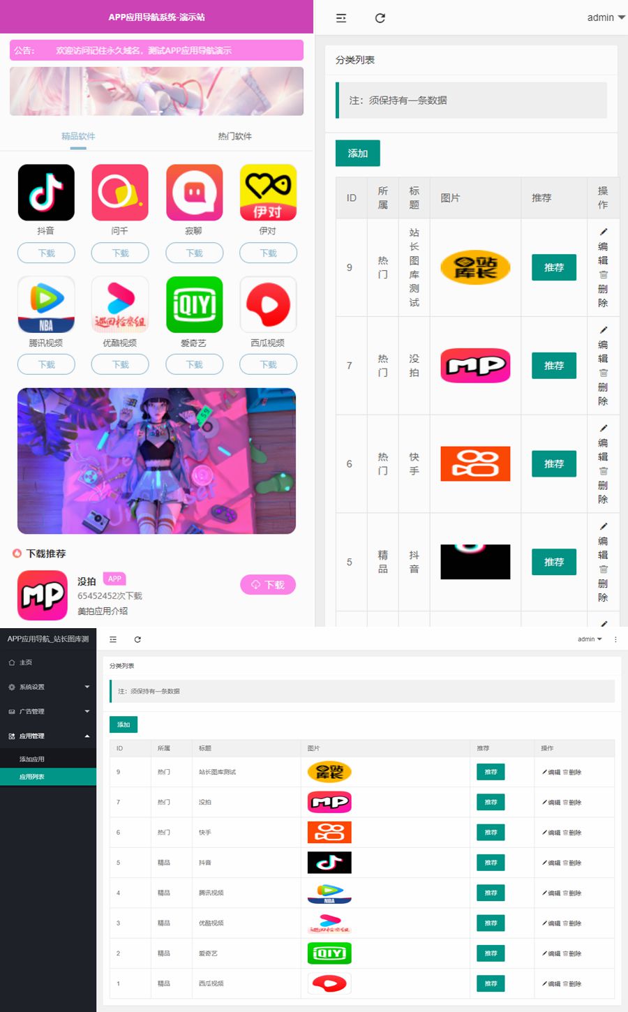 后台添加应用及轮播广告也非常方便,小白看了都会!tp的后台响应也特别丝滑,压缩包内附详细安装说明~