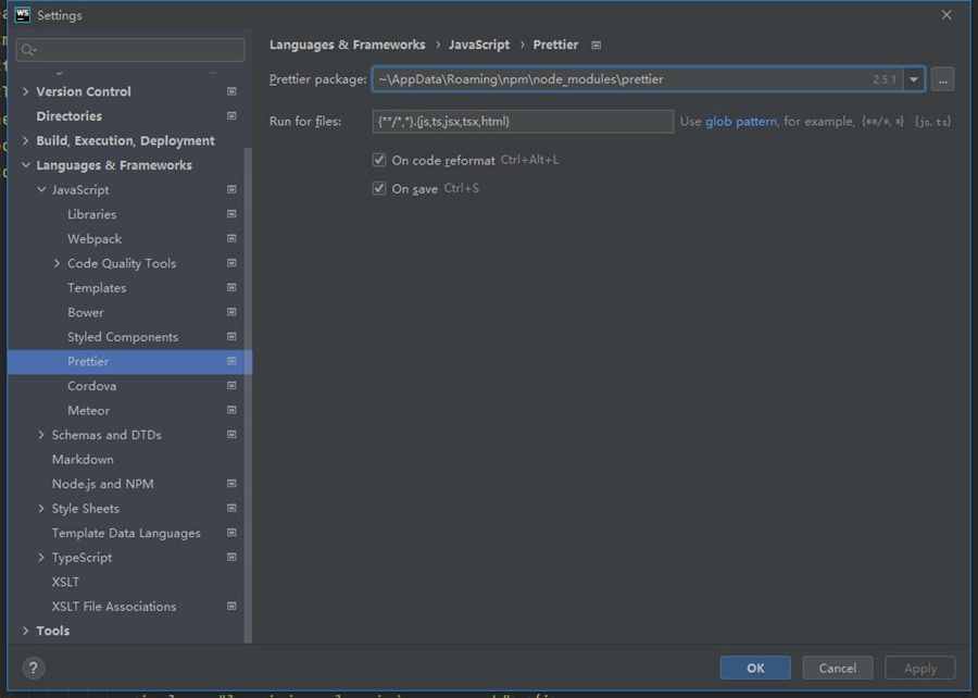 打开webstorm点击菜单file打开Settings/Languages and Frameworks/JavaScript/Prettier. 如图所示: