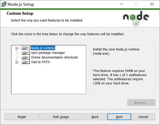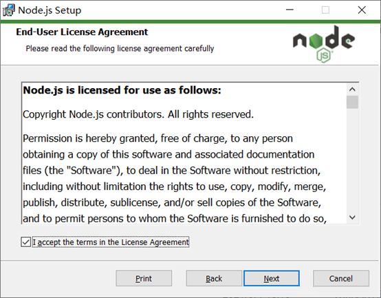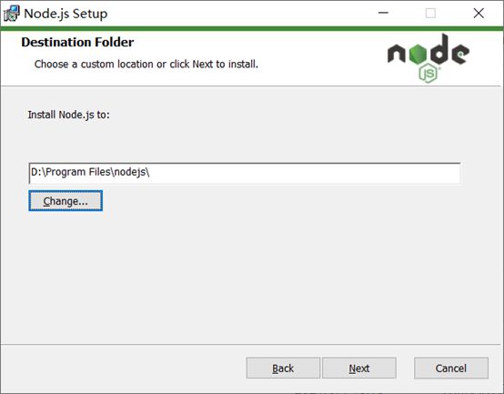 Node.js默认安装目录为 "C:\Program Files\nodejs\" ,可以修改目录(我修改了盘符D),然后点击 next按钮,将出现如下界面: