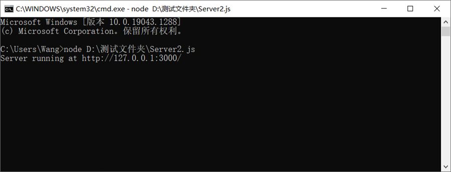 编写了.js的程序,运行的时候就要通过node.js来运行了,在CMD中先切换到编写程序的目录下,然后用node XXX.js即可启动服务,若不先切换路径,则用node 路径\XXX.js启动服务。然后在浏览器中输入相应的监听IP地址加上端口号,这里的端口号使用比较大一点的就可以,因为是回环测试,所以使用127.0.0.1来作为测试IP。