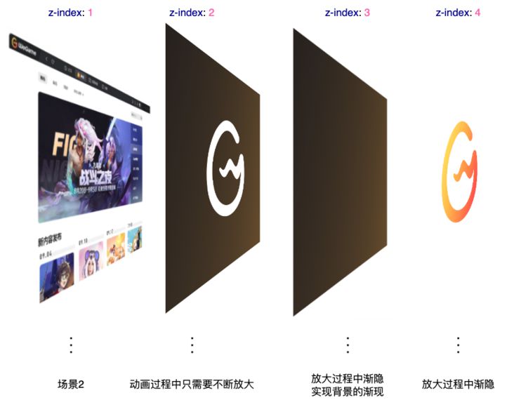 LOGO 放大到一定程度,开始渐隐,LOGO 背后的场景 2 逐渐渐现
