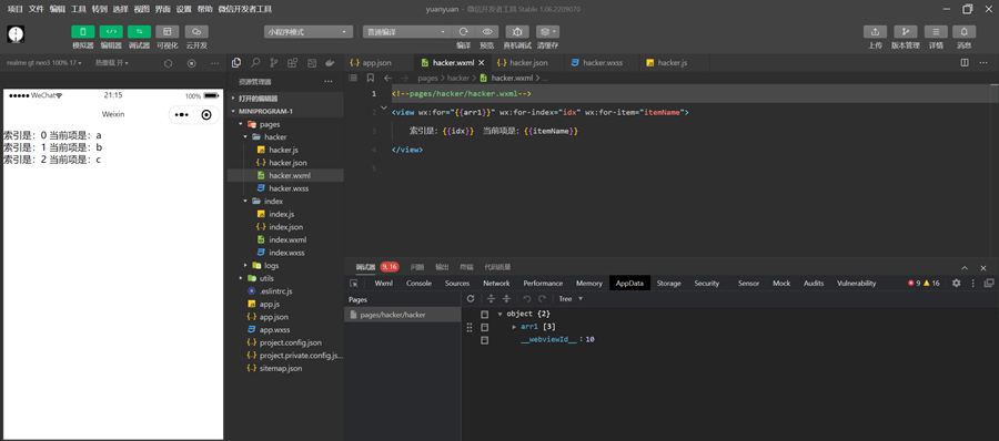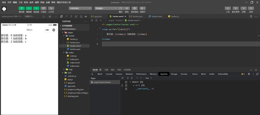 </view>默认情况下,当前循环项的索引用index表示;当前循环项用item表示 hacker.wxml 定义一个for循环访问数组