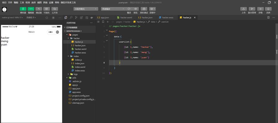 <view wx:for="{{userList}}" wx:key="id">{{item.name}}</view>hacker.js