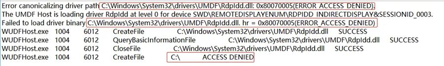 远程都有个RDPiDD (RDP indirect display)的过程,这个过程 C:\Windows\System32\WUDFHost.exe会调用C:\Windows\System32\drivers\UMDF\RDPidd.dll