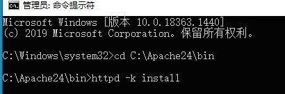 在管理员模式下 打开CMD 目录切换到 刚解压的Apache2.4/bin 命令行 输入:http -k install 安装