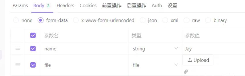 如果我们现在向服务器发送的数据如下图所示,里面包含了普通的字段信息 name 以及一个图片文件 file: