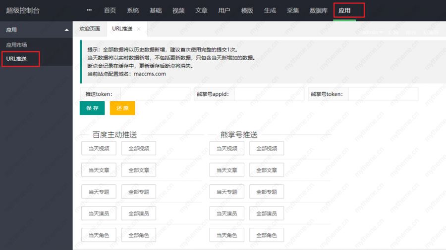 1、复制token后到苹果cmsv10后台>应用>URL推送>把复制的内容粘贴到>>推送tokne的框里保存,看图