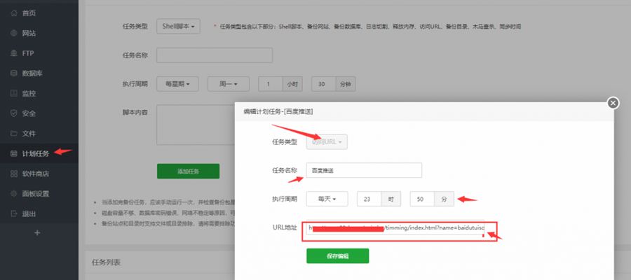 1、登录宝塔面板-计划任务-添加计划任务,url地址就是上面复制的那个粘贴保存。我设置的是每天晚上11.50左右提交当天视频
