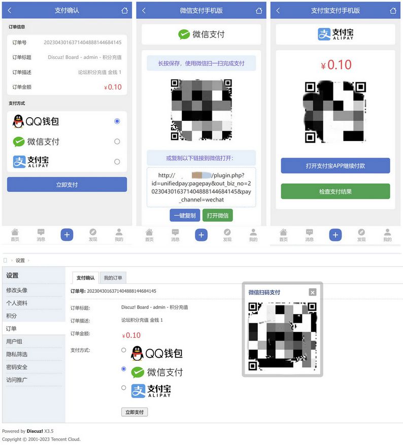 Discuz论坛多合一聚合支付接口插件,该插件直接替换了自带的支付接口功能,增强了支付的扩展性,自带支持支付宝、微信、QQ钱包官方支付,以及彩虹易支付、我爱支付、虎皮椒等支付通道,并且可以自由扩展其他的支付通道。