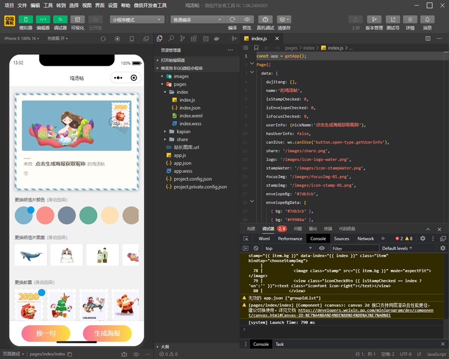 这是一款用于发送唯美贺卡的一个小程序,界面唯美简洁,无需后台可直接运营,可以自定义卡片内容图标、邮票等元素,QQ微信小程序都可以直接使用,对接了部分广告,大家可以根据自己的广告id进行替换。