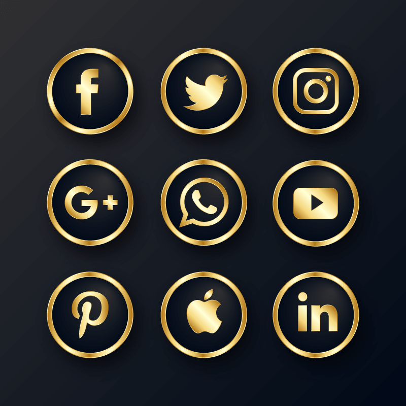 这是一款奢华的社会化图标矢量素材,共 9 个,包含了 Facebook、Twitter、Google+、Whatsapp、Linkedin、YouTube、Apple 等等,提供了 EPS 和免扣 PNG 两种格式。