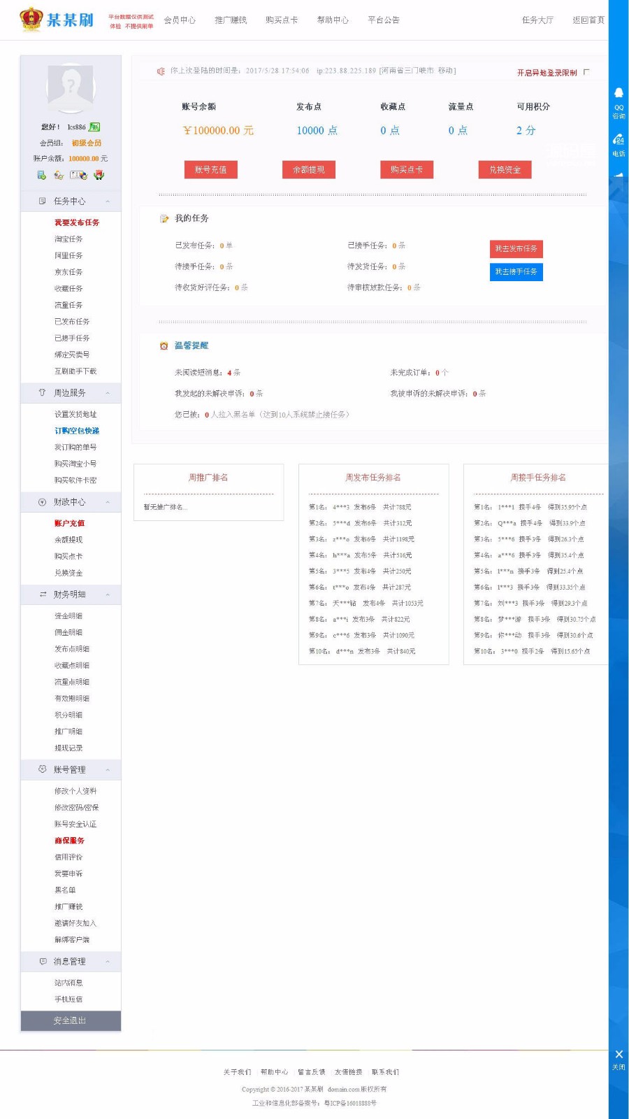 2、系统主要由淘宝任务、天猫任务、阿里任务、京东任务、美团任务、收藏任务、流量任务、快递单购买系统、信用评价系统、会员系统、文章系统、广告系统、推广系统(五级分销)等20多个功能模块组成。