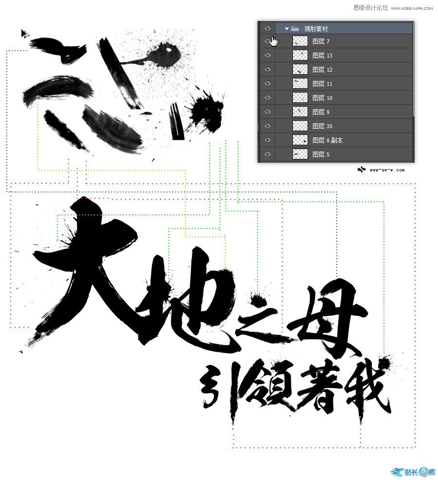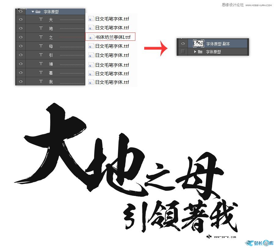 用毛笔字体打出文字的原型(本例主要用到'日文毛笔字体',由于打不出"之"字于是用'书体坊兰亭体'代替)打出所以文字并调整文字大小和位置后,备份一份后合并'字体原型'组