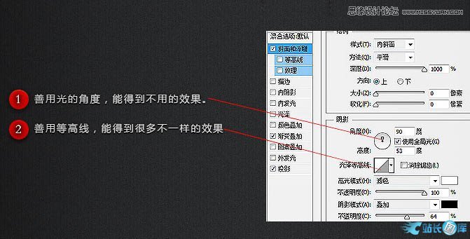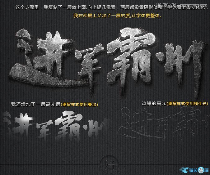 4、这个步骤里,我复制了一层放上面,向上提几个像素,两层都设置阴影使整个字体看上去立体化。我在两层上又加了一层材质,让字体更整体。