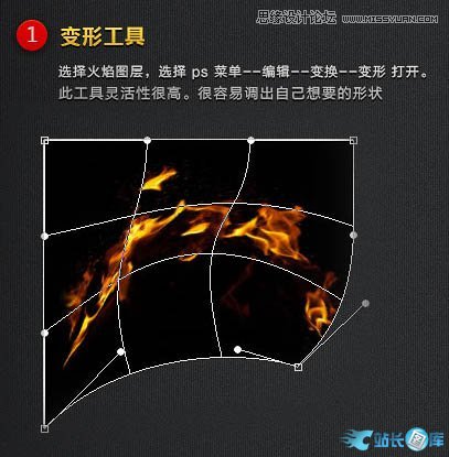 7、最后一步添加火焰效果,火焰需要经过简单的变形处理,然后把混合模式改为"滤色"。