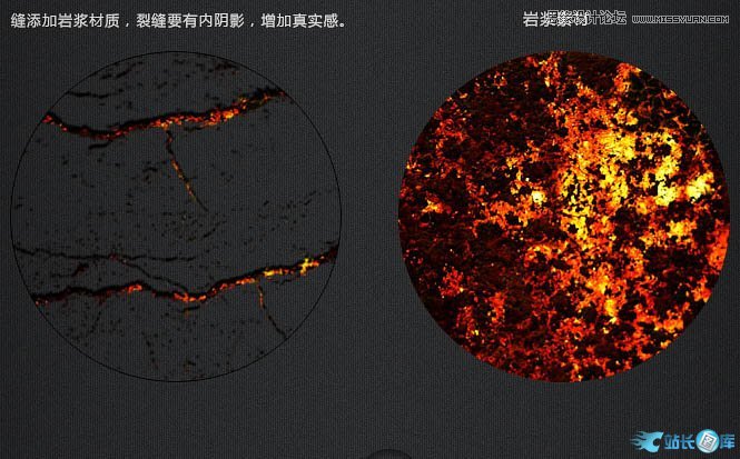 6、我使用墙壁裂缝的素材贴上去,裂缝里贴进岩浆的素材。