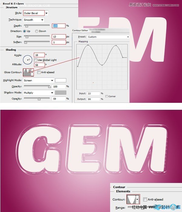 4。双击文字层,打开 图层样式,设置斜面浮雕。