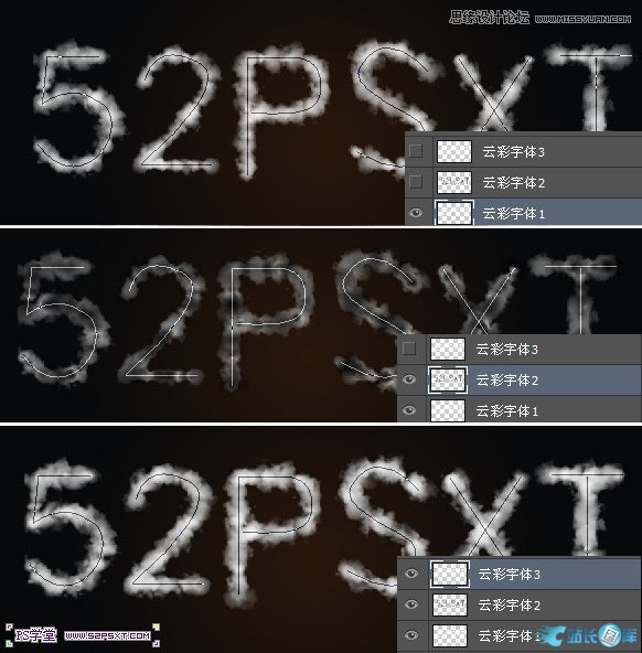 4.在这里我们新建三个图层,分别为"云彩字体1""云彩字体2""云彩字体3",图层1描边白色,图层2描边3e3434,图层3描边白色。这样我们的云彩字体就会更有层次感