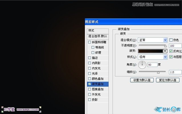1.新建1920*1200px大小的文档,我们给背景层做个渐变叠加的图层样式(当然你也可以直接拉渐变),颜色从#07090b到#27160a
