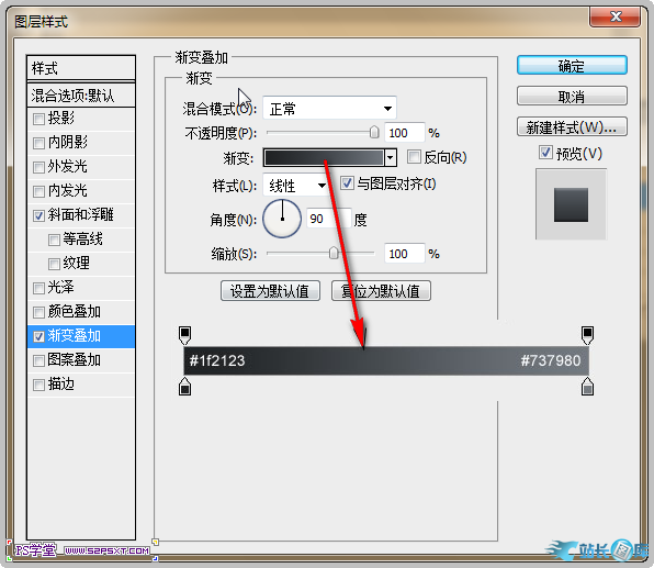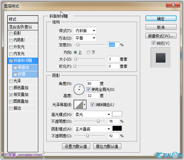 4、为文字添加图层样式:斜面和浮雕,渐变叠加,数值如下。