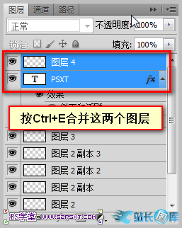 6、新建图层,将此图层移到文字图层的上面,将此图层和文字图层选住,按Ctrl+e合并,这样做是让矢量的文字图层变成普通文字图层,同时合并掉了图层样式,方便下面的操作。