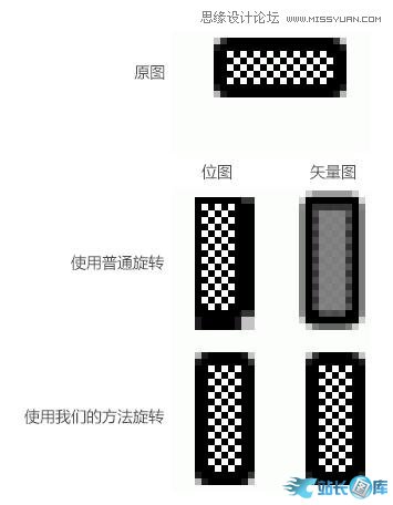 本例中原始图层的尺寸为20×9像素:偶数×奇数。尽管位图和矢量图层在旋转后的效果不一样,但两者都变得不可用了。这是由于图层旋转的中心点没有落在某个像素边界上导致的。