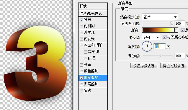 8、在选择3字图层的图层1,对它的斜面浮雕更改数值,这改不改都行,目的是为了后边角有点高光。