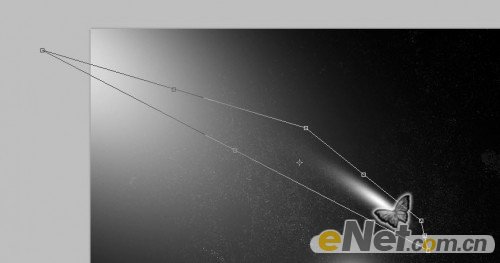 做一个光的抽象显示,新建一个层命名为"光轨"然后使用软角白色笔刷,在调出"自由变换"工具,如下图制作扭曲的变换