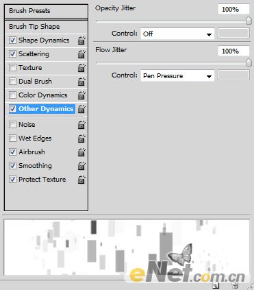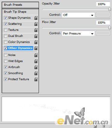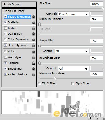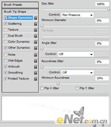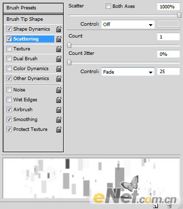 下面我们来给图像设置飞溅的水珠,按F5调出画笔设置,设置笔尖为硬笔,然后大小为1px,其它参数如下图所示