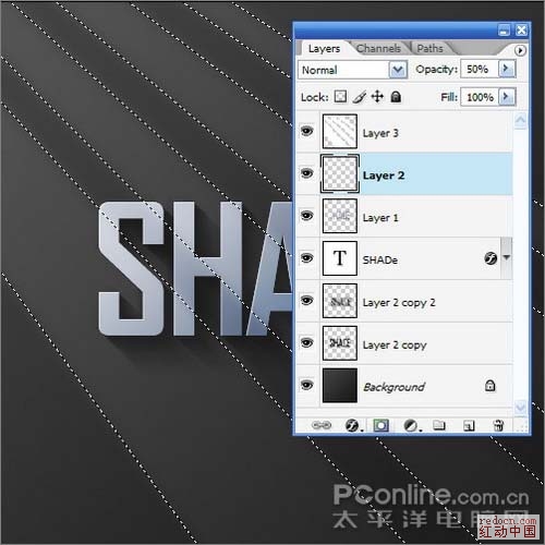9、现在你可以看到,刚才做出来的小小白线为文字图层添加了如同高光的效果。物体面向光源的一面会有高光出现,这样的效果使得我们的文字更为立体。