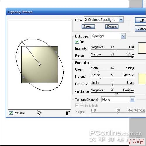 18、在粉红图层之上新建一个图层,填充整个为白色,然后使用滤镜>渲染>灯光效果。作者并不是经常使用灯光效果,但其中的2点钟聚光(Two O'clock Spotlight)效果十分酷。在灯光效果面板选择刚才提到的Two O'clock Spotlight,你可以直接使用默认设置的效果,但为了更好地实现我们的想法,最好稍微拉长光效的椭圆形(这会使光源效果延长一些)。