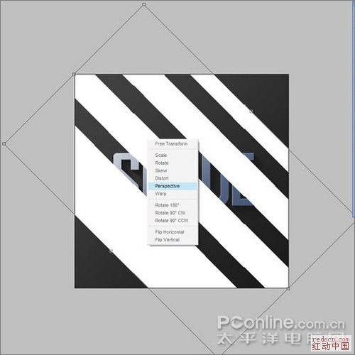 11、按下Ctrl+T进行自由变换,旋转和放大到如下图的效果,然后按下右键呼出菜单,选择透视。把左方的两个变换点拉得靠近一些,使白色矩形看起来是从左上方发散出来的。