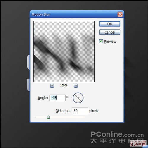 5、下图是你现在应该得到的效果。取消阴影图层的选区,然后使用滤镜>模糊>动感模糊,角度为-45度,距离30像素。