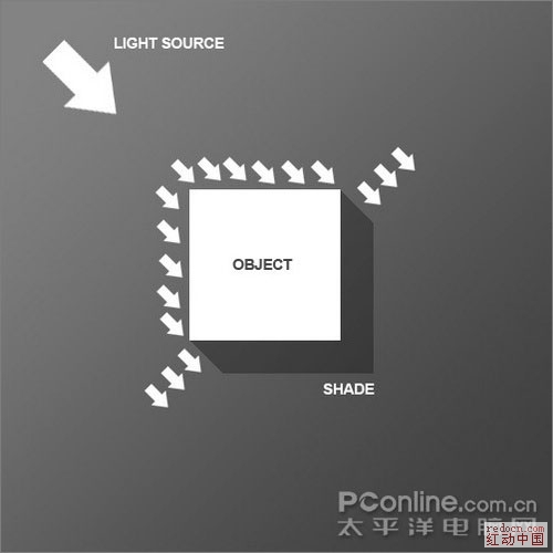 光源:在我们开始教程之前,先来看看一个光源是怎样对物体产生影响的。如图,画面中间有个正方体,它的左上方有一个明亮的光源。当光照射到正方体,就会在另一边产生阴影。这种阴影和Photoshop中的阴影(指图层样式)有截然不同的效果,看上去能够令物体跃然纸上。如果我们想令一个物体具有三维立体感,不需翻看沉闷的教科书,这里的光与影就是答案。
