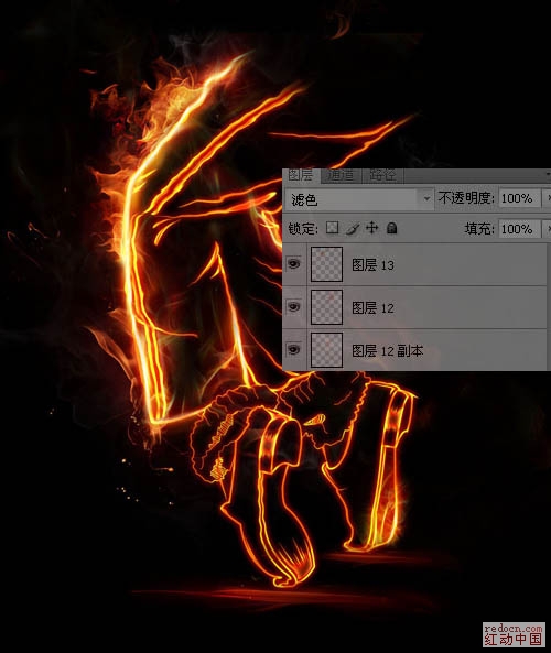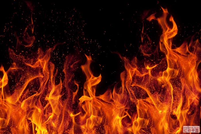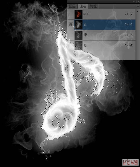 5、打开合适的火焰图片,进入通道面板,选择红色层。CTRL+左键点击红色层载入高光区。回到图层面板,适用移动工具,将选中的区域移动到刚才的文字文件中,将火焰置于文字层上方。(注意:这里我们是利用通道来载入选区。在移动的时候请确保所有通道都是可见的。否则可能移过去的是黑白的)