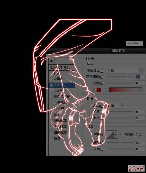 2、给图形添加图层样式,参数设置如下图:外发光。