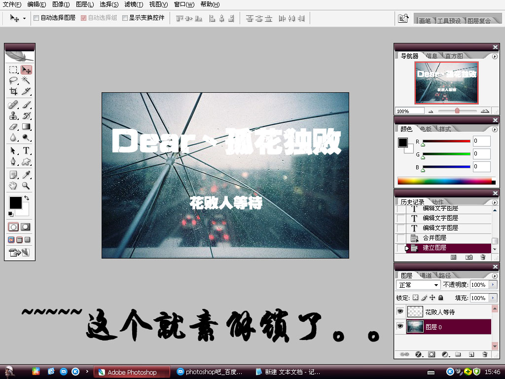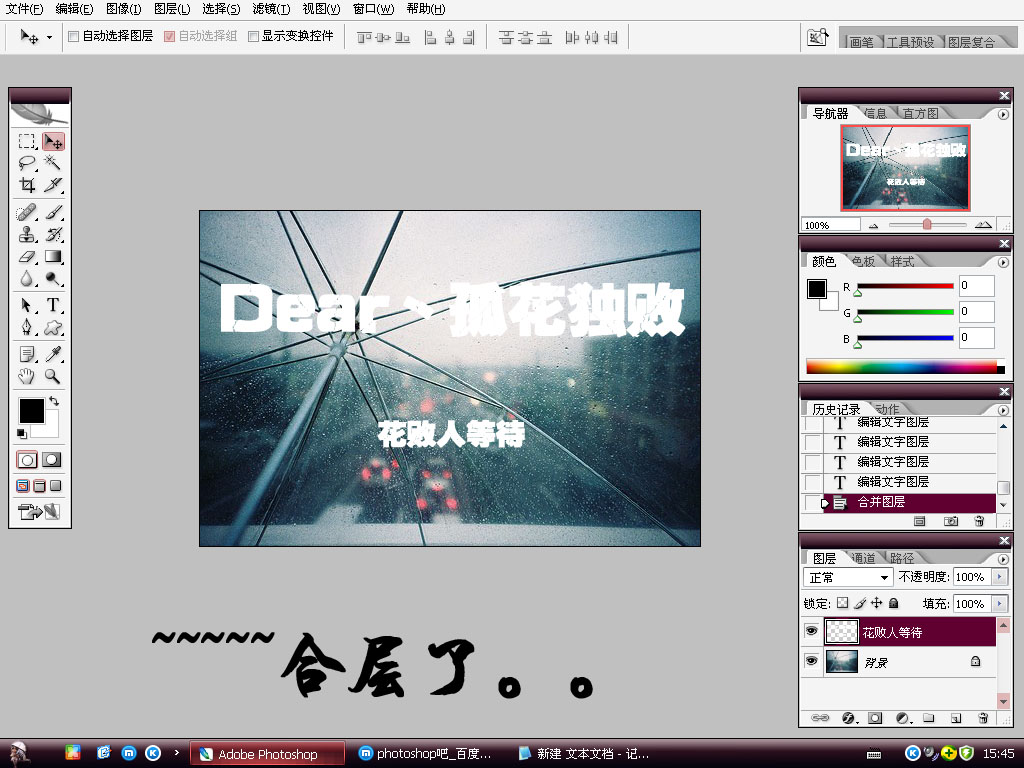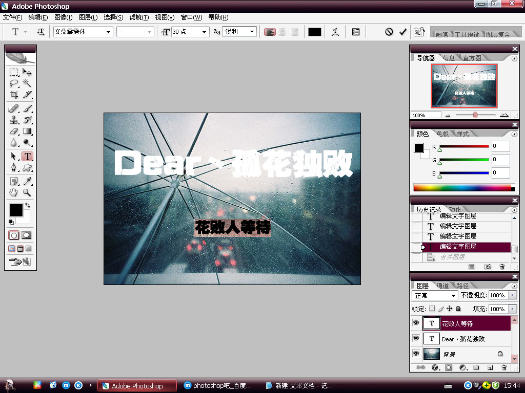 2.打上自己喜欢的字。。我这里使用的是文鼎霹雳体。白色的字哦。。我这里为了方便调整我打了两节字,打完了为了方便调整就合层。