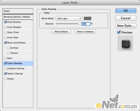5.选择“图案叠加”,从图案中选择“生锈金属”,然后参数如下设置。